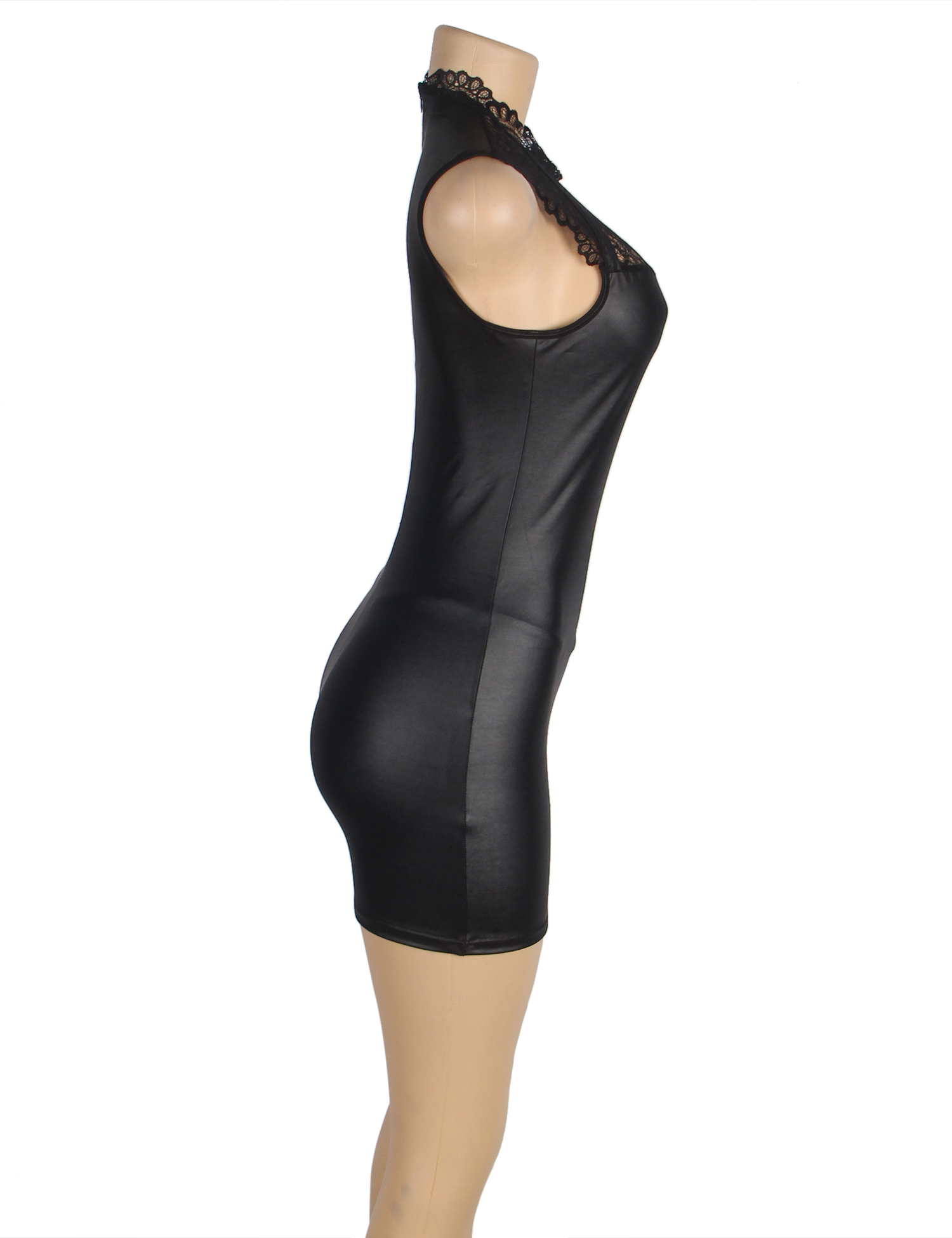 Standard product name: Black, faux leather, lace splicing at the neckline, invisible zipper at the back, includes thong, sizes M-5XL plus size, ladies` fitted bodycon faux leather skirt.