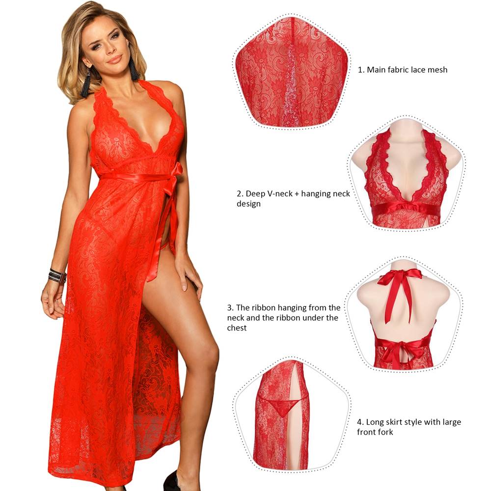Standard product name: red lace mesh, deep V-neck, halter ribbons + non-removable ribbon under the chest, high slit on the front, paired with thong, M-5XL plus size, fashionable long nightgown.